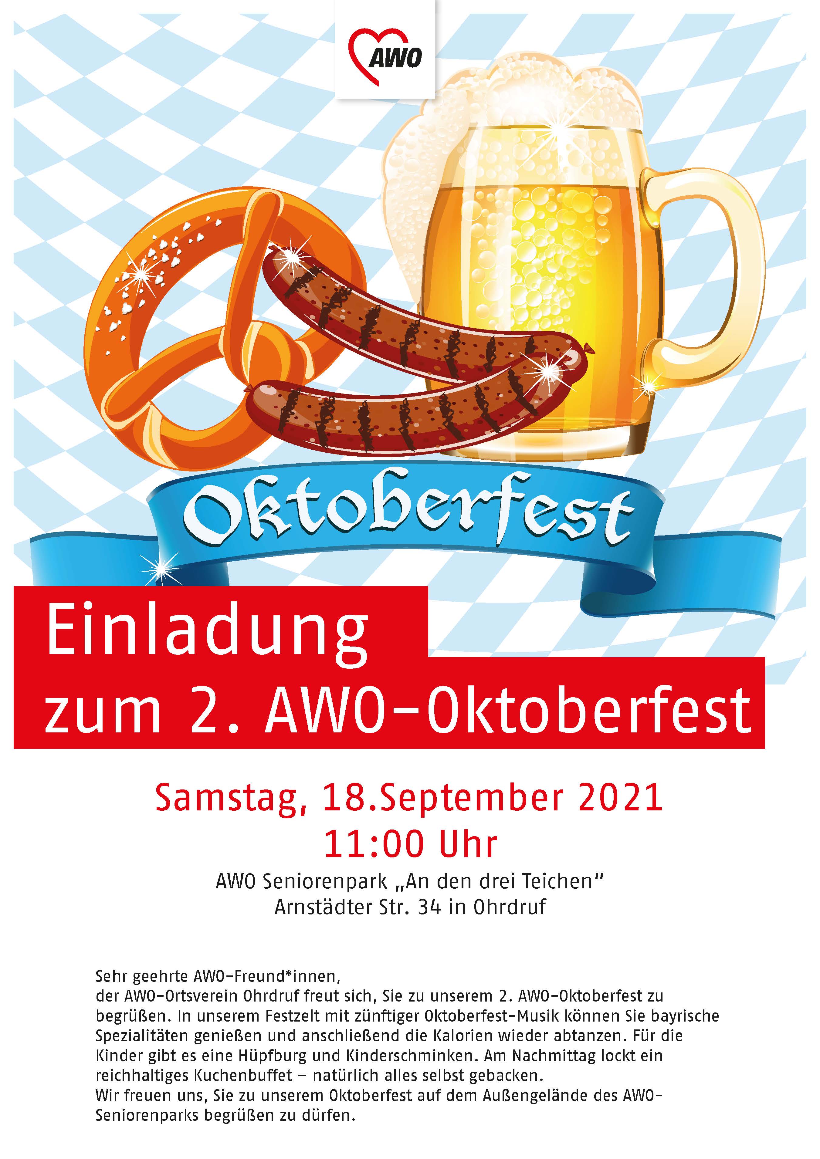 Am 18. September lädt der AWO Ortsverein Ohrdruf ab 11 Uhr zu seinem zweiten Oktoberfest ein. Dafür wird auf dem Außengelände des AWO Seniorenpark "An den drei Teichen" ein großes Festzelt aufgebaut, in dem die Gäste zu zünftiger Oktoberfest-Musik bayrische Spezialitäten genießen und anschließend die Kalorien wieder abtanzen können.