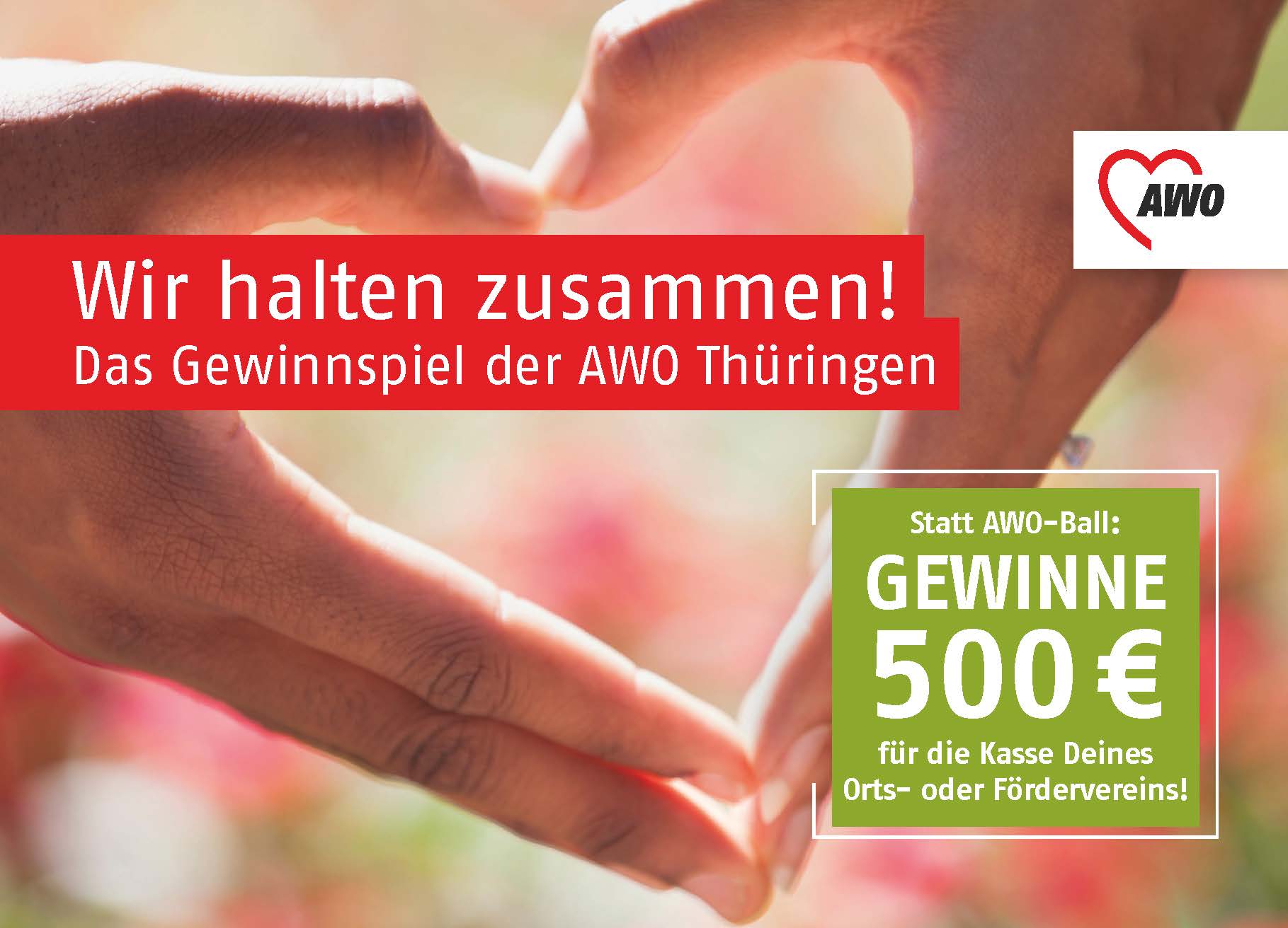 Unter den Motto "Wir halten zusammen" startet die AWO Thüringen am 12. Oktober 2021 ein Gewinnspiel für AWO-Mitglieder der Thüringer Orts- bzw. Fördervereine. In der Zeit von 10 bis 17 Uhr können die Teilnehmer*innen 500 Euro für ihre Vereinskasse gewinnen.